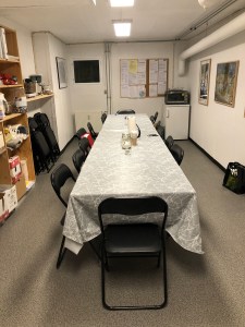 Lokalet indeholder et køleskab og en kaffemaskine samt bord og klapstole. Der kan sidde 14-16 personer rundt om bordet.